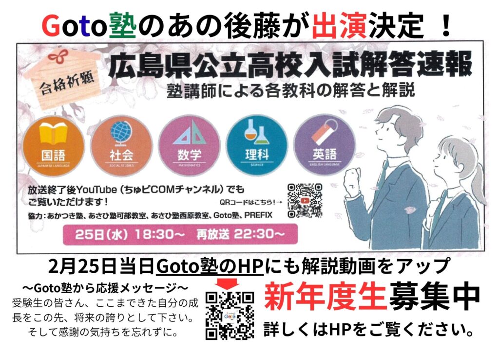 公立高校入試 解答速報 2026年1月8日 最終更新日時 : 2026年1月17日 Goto塾 今年も広島県公立高校入試の解答速報をします。2月25日(水)に放送されます。当日の放送はこちらからご覧いただけます。是非ご覧ください。 ちゅピCOMチャンネル - YouTube 広島のケーブルテレビちゅピCOMの公式YouTubeアカウントです! YouTubeに今まで公開してきた地域情報をお届けしています。 YouTube 昨年の様子がコチラ!
